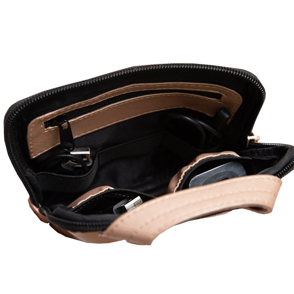 Ésta bolsita portacables cuenta de un lado, con 3 elásticos que permiten colocar tus cables en rollito, y cuenta con un cierre en la parte de arriba para guardar memorias usb o SD. Del lado frontal cuenta con 2 bolsas para almacenar cuadros de carga. Se graba con iniciales y/o logotipo troquelado. Fabricado en material sintético texturizado.