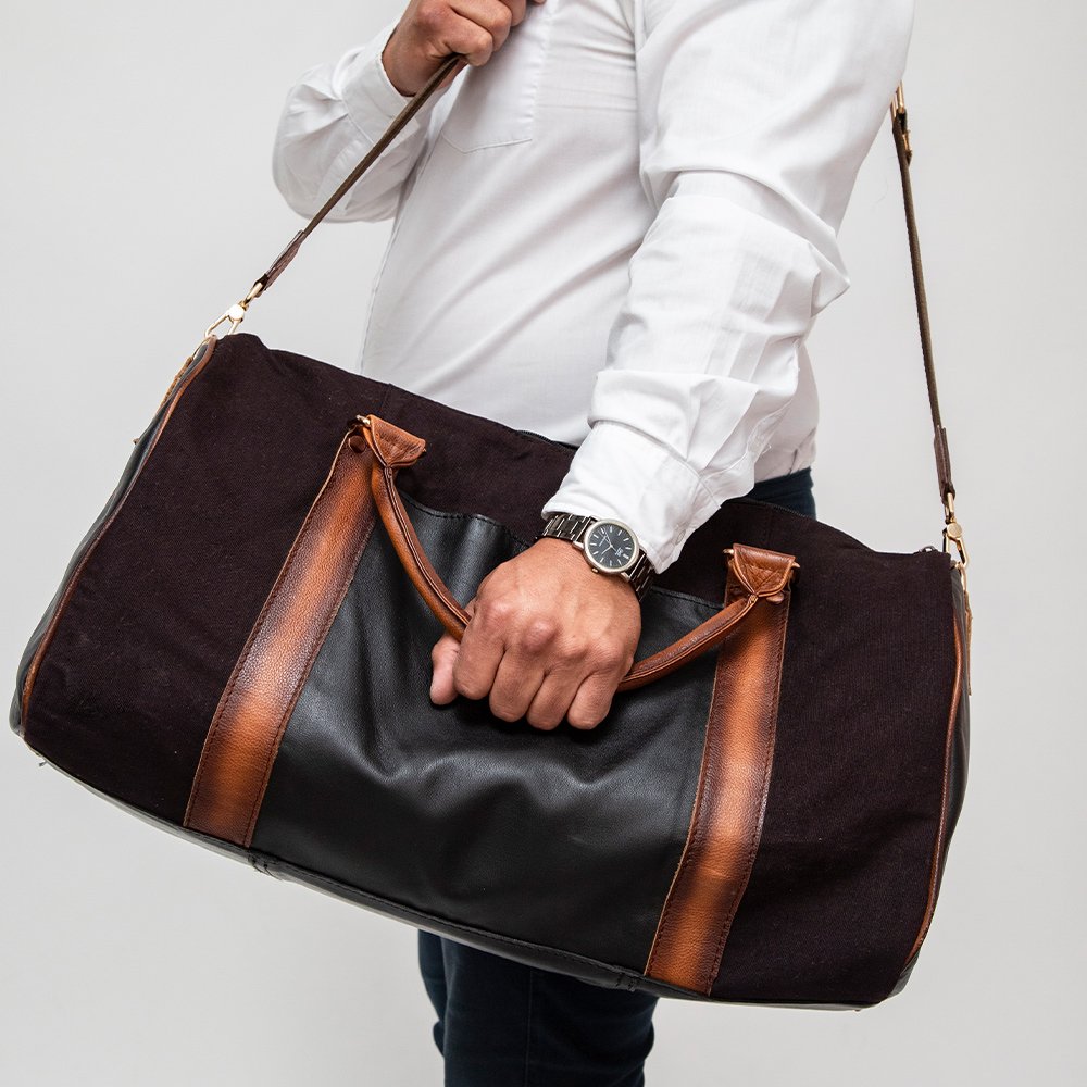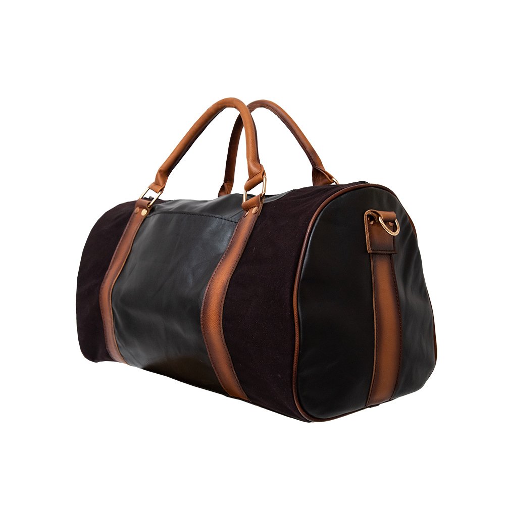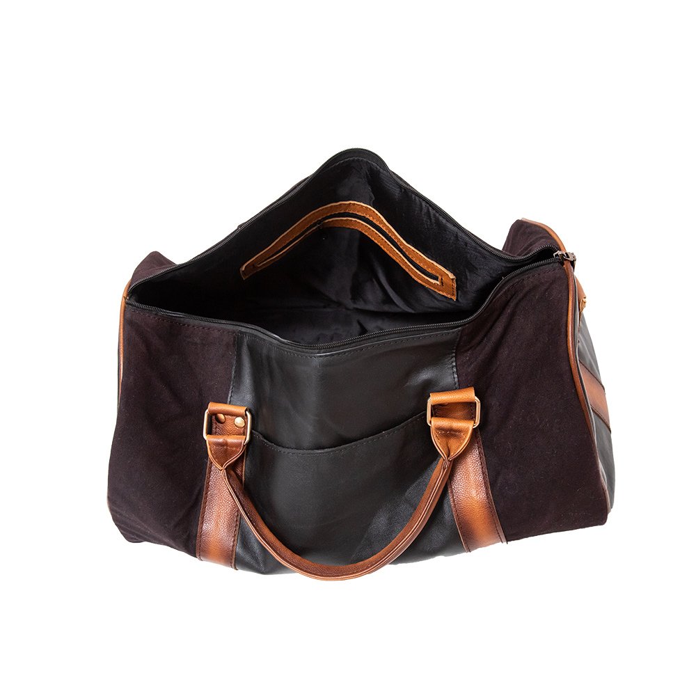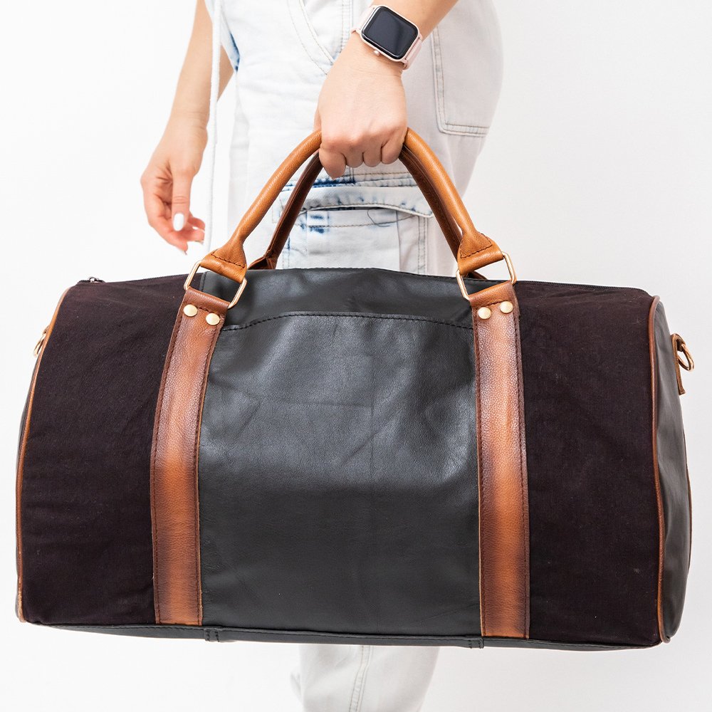 Maleta amplia combinada en tela con piel. Útil para gimnasio y/o viajes. Se graba con iniciales y/o logotipo troquelado. Fabricado en piel genuina de res con tela gruesa.